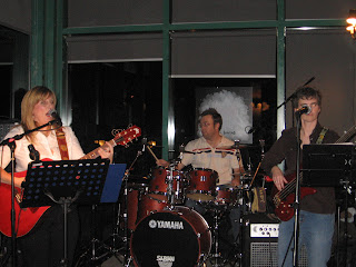 My day yesterday was pretty fun. I wasn't really planning on doing much besides hanging out around the house and maybe watching some college football and working on the shawl I'm knitting at the moment. Instead, I got invited to go shopping with Emma (her husband works with us at Co-Ex-Tec and we went to their house for dinner last Saturday--they're from England) at Yorkdale Mall, which I'd never been to. She was looking for a Christmas party dress, but she didn't find anything. However, I found a new pair of jeans and a cute new dress. At night, her husband, Mat, had a gig with his band, Runs with Scissors, at a little pub about a half hour north of our house. He invited me to go, and since I love live bands, it was an easy decision to say yes. There were some other people from work there, too, including Kristen, who left about a month ago. It was nice to see her again. The band was great! Mat is the drummer, Louise is the singer, and Sarah is the bass player. They do lots of different stuff, but mostly songs from female artists like Jewel, Sarah Maclachlan, and the Dixie Chicks. They also write some of their own stuff, and Mat wrote a really cool song a few weeks ago when he was on business called "Gonna Come Home Soon." It was really neat to watch, because it was the first time that Emma had heard it, and since he wrote it for her, she got all teary eyed at the end. How cute! They did four sets, and I ended up being the only person that stayed for all of them, but it was totally fun. I'll be excited when they play again so that Gary can go with me! I'm such a groupie....here are some pictures!